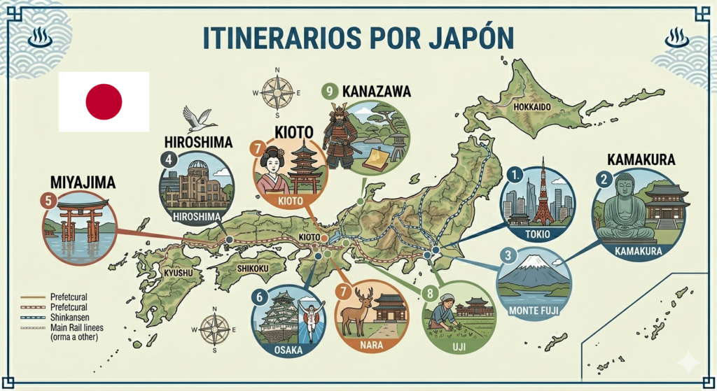💡 Importante: Estas rutas son solo propuestas, no reglas. Siéntete libre de mezclar, adaptar y crear tu propia combinación: ¿por qué no 4 días en Tokio + 3 en Kioto? ¿O una semana entre Kanazawa, Shirakawa-go y Takayama? Tú marcas el ritmo.