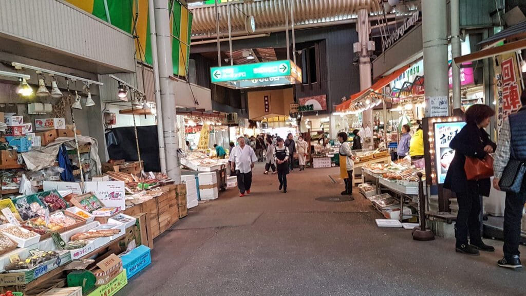 El Mercado Ōmichō (Ōmichō Ichiba) es el mercado cubierto más importante de Kanazawa y el alma gastronómica de la ciudad desde hace más de 280 años. Conocido como «la cocina de los ciudadanos de Kanazawa», aquí es donde los chefs locales y los residentes acuden a comprar los ingredientes más frescos y de la más alta calidad. Situado a poca distancia de la estación, es famoso por su marisco increíblemente fresco del Mar de Japón, como el cangrejo de nieve (zuwaigani), las vísceras de salmón (burikko), las anguilas de mar (anago) y el atún. Pero no solo es marisco: también encontrarás puestos de verduras, frutas, carnes, encurtidos y tiendas de souvenirs gourmet. Es una experiencia sensorial vibrante, llena de colores, olores y la energía de la vida cotidiana japonesa.