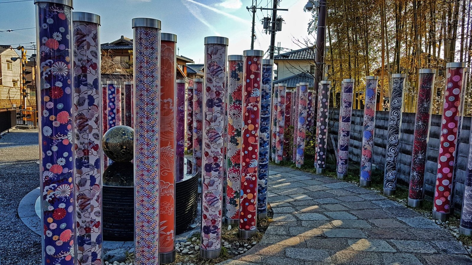- Pasear por el Kimono Forest (Kimono no Mori):** Un sendero de pilares de vidrio iluminados que contienen hermosos tejidos de kimono (kyō-yūzen). Es especialmente mágico al anochecer, cuando las luces LED se encienden y crean un túnel de colores.