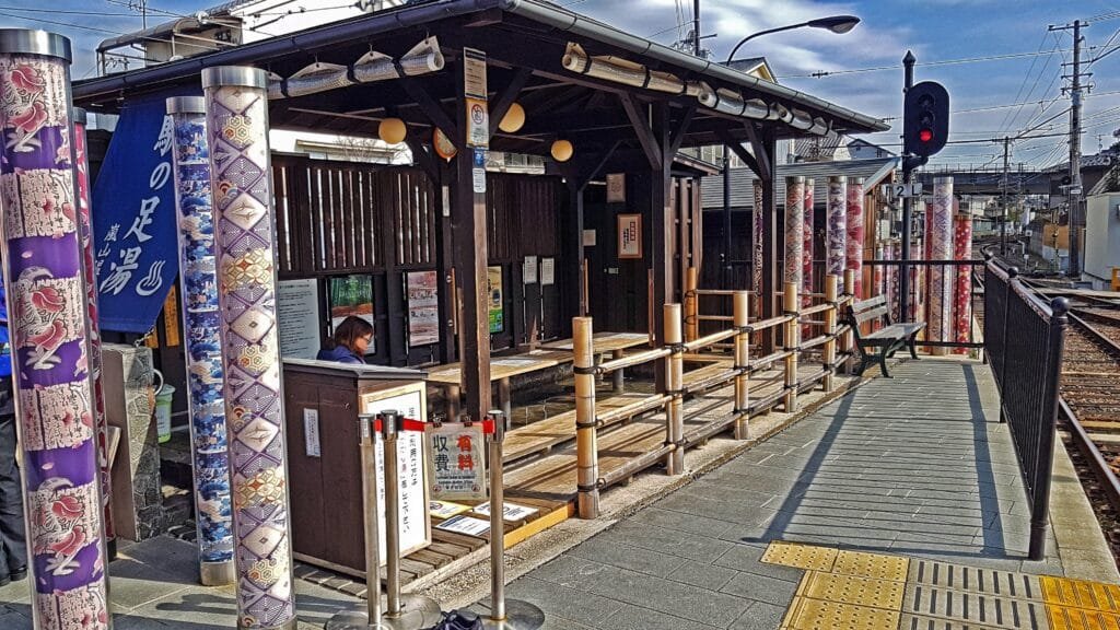 - Relajarse en el Baño de Pies (Arashiyama Onsen «Fufu-no-yu»):** Un baño de pies de aguas termales naturales (onsen) gratuito ubicado en el andén 1. Perfecto para aliviar la fatiga después de caminar por Arashiyama. (Se alquilan toallas por 100 JPY).