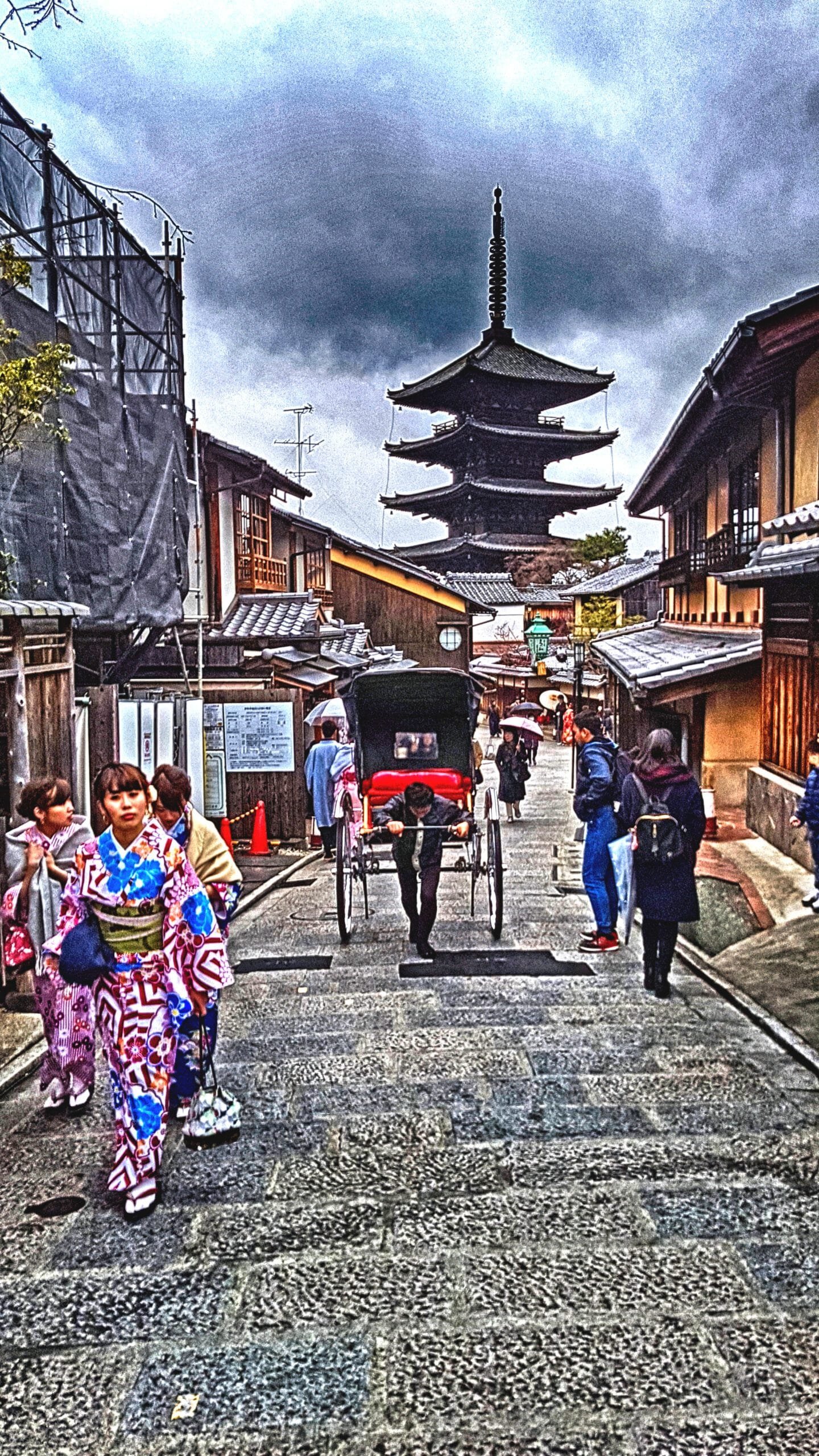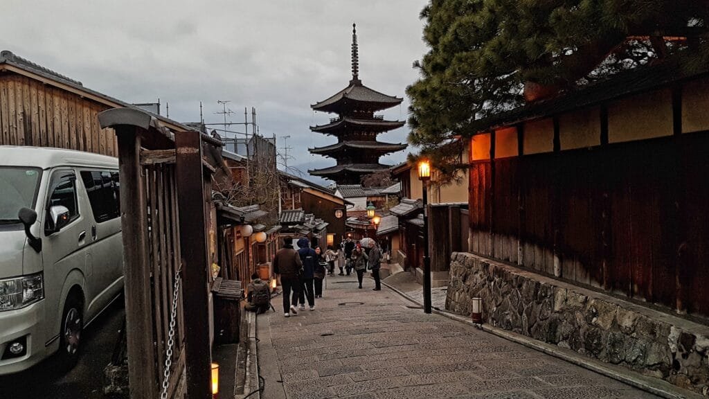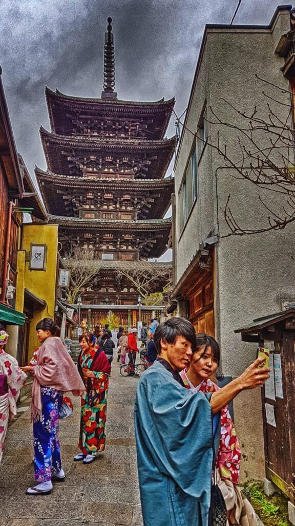 - Admirar la Pagoda Yasaka (Hōkan-ji): La pagoda de cinco pisos que asoma entre los tejados es la silueta más reconocible del skyline tradicional de Higashiyama. Es especialmente bella al atardecer.