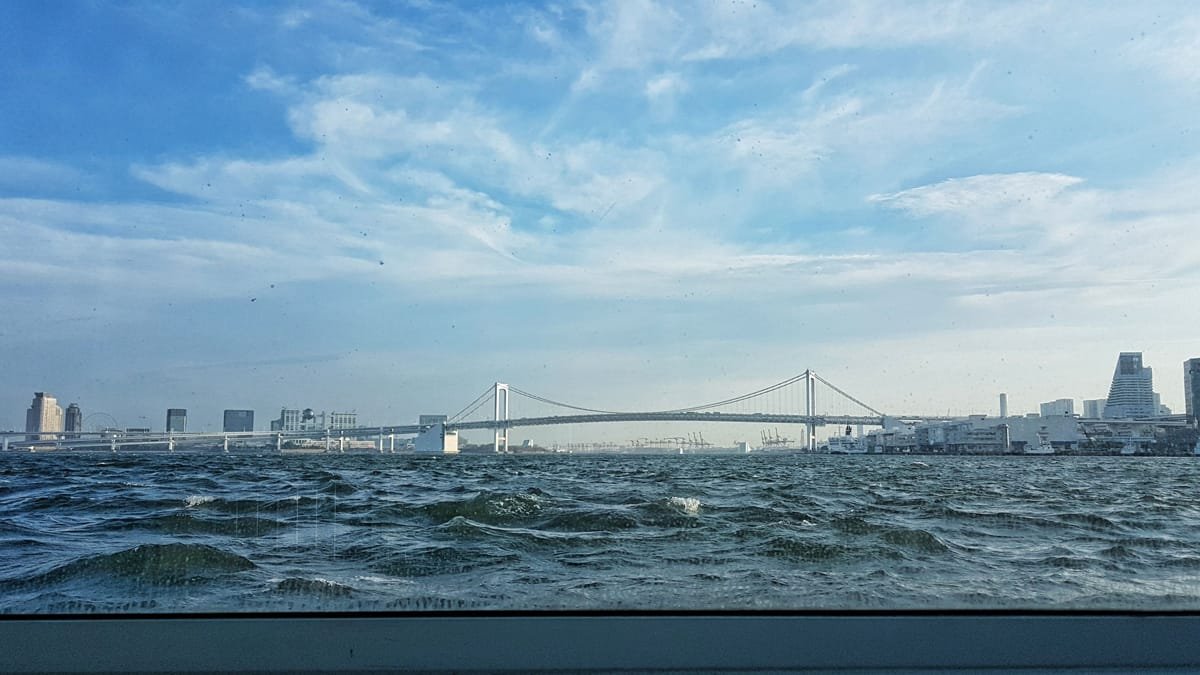 Continuamos hasta Odaiba: pasamos bajo el Rainbow Bridge y vemos la Estatua de la Libertad japonesa, el Fuji TV Building y el skyline de Shinagawa.
