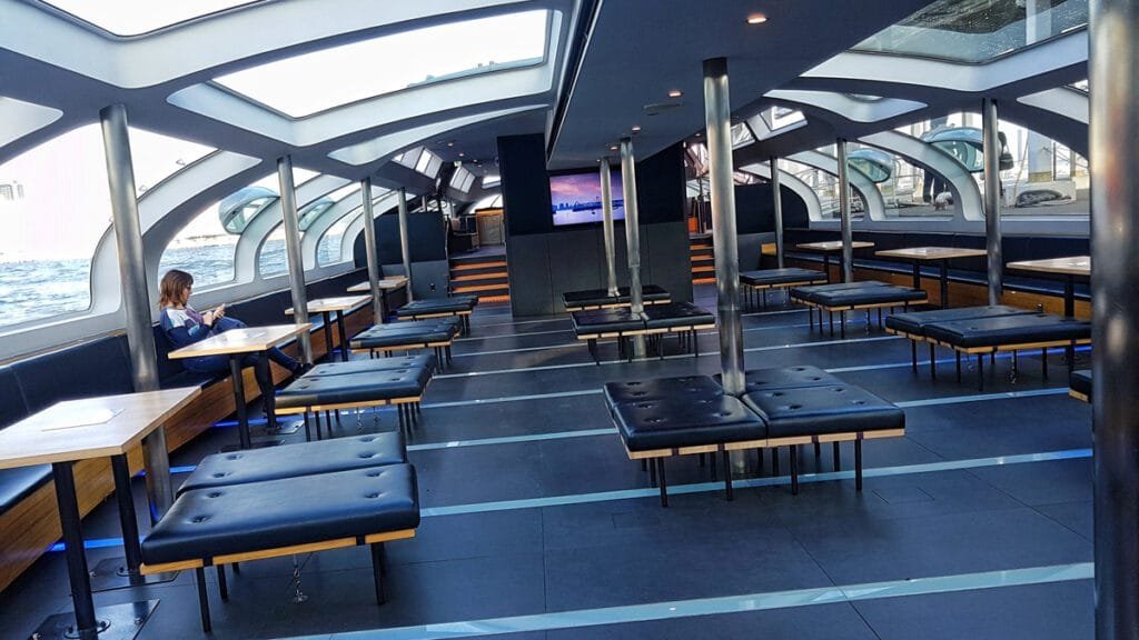 Su diseño abierto, minimalista y tranquilo: sin ventanas, sin techos bajos, sin megafonía. Solo madera clara, bancos cómodos y el agua pasando bajo nuestros pies. Parece un ryokan flotante… por el precio de un billete de autobús.