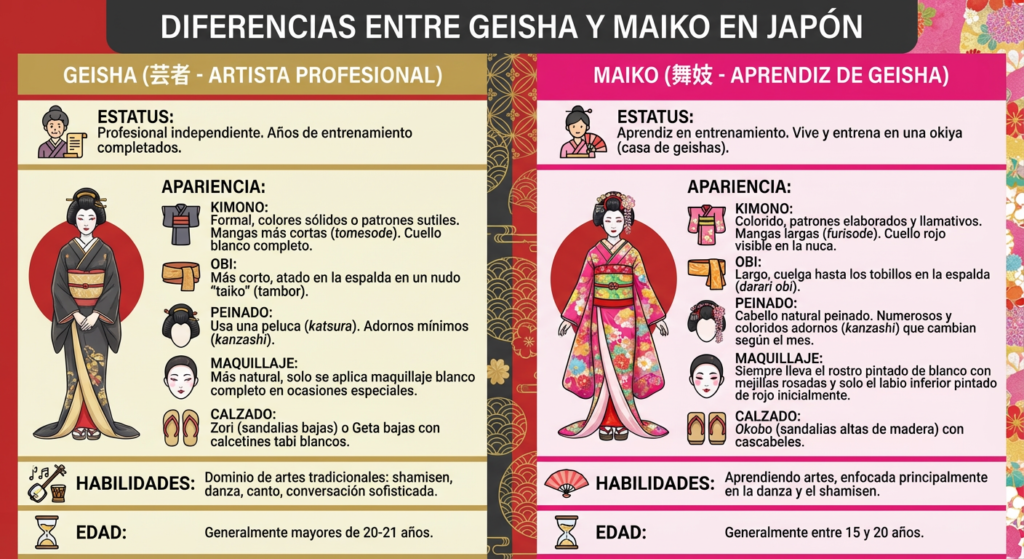 Las Maiko son jóvenes en formación, mientras que las Geishas son artistas profesionales que han completado su aprendizaje.