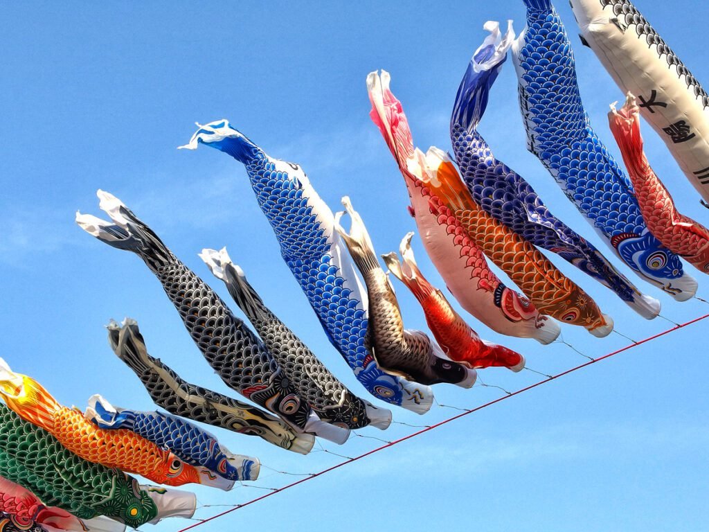 Seguramente que todos hemos visto alguna vez este tipo de banderas en forma de carpas, su nombre es koinobori(鯉幟) o Satsuki-nobori (皐幟, さつきのぼり) y son las banderas tradicionales japonesas que se izan en los días especiales de los niños como el Kodomo no hi. Tradicionalmente los japoneses asocian las carpas con los niños pues estas representan la fuerza, por la destreza que demuestran al remontar los ríos a contra corriente.