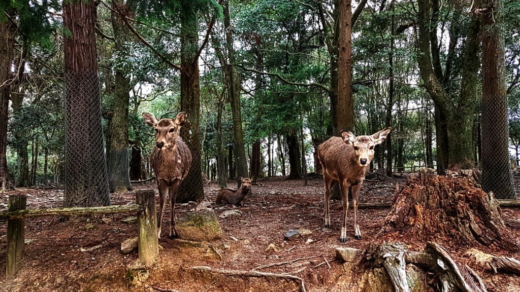 El Parque de Nara es el lugar ideal para encontrarse con más de mil ciervos que recorren libremente sus extensos jardines. Uno de los aspectos más fascinantes de estos animales es su capacidad para hacer reverencias, una conducta que han aprendido para pedir comida a los visitantes. En el parque se venden los tradicionales shika senbei, galletas especiales que los turistas pueden ofrecer a los ciervos de manera segura.